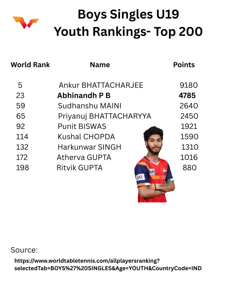 WTT World Ranking Youth Boys Indian players in top 200. Abhinandh Leads from TN