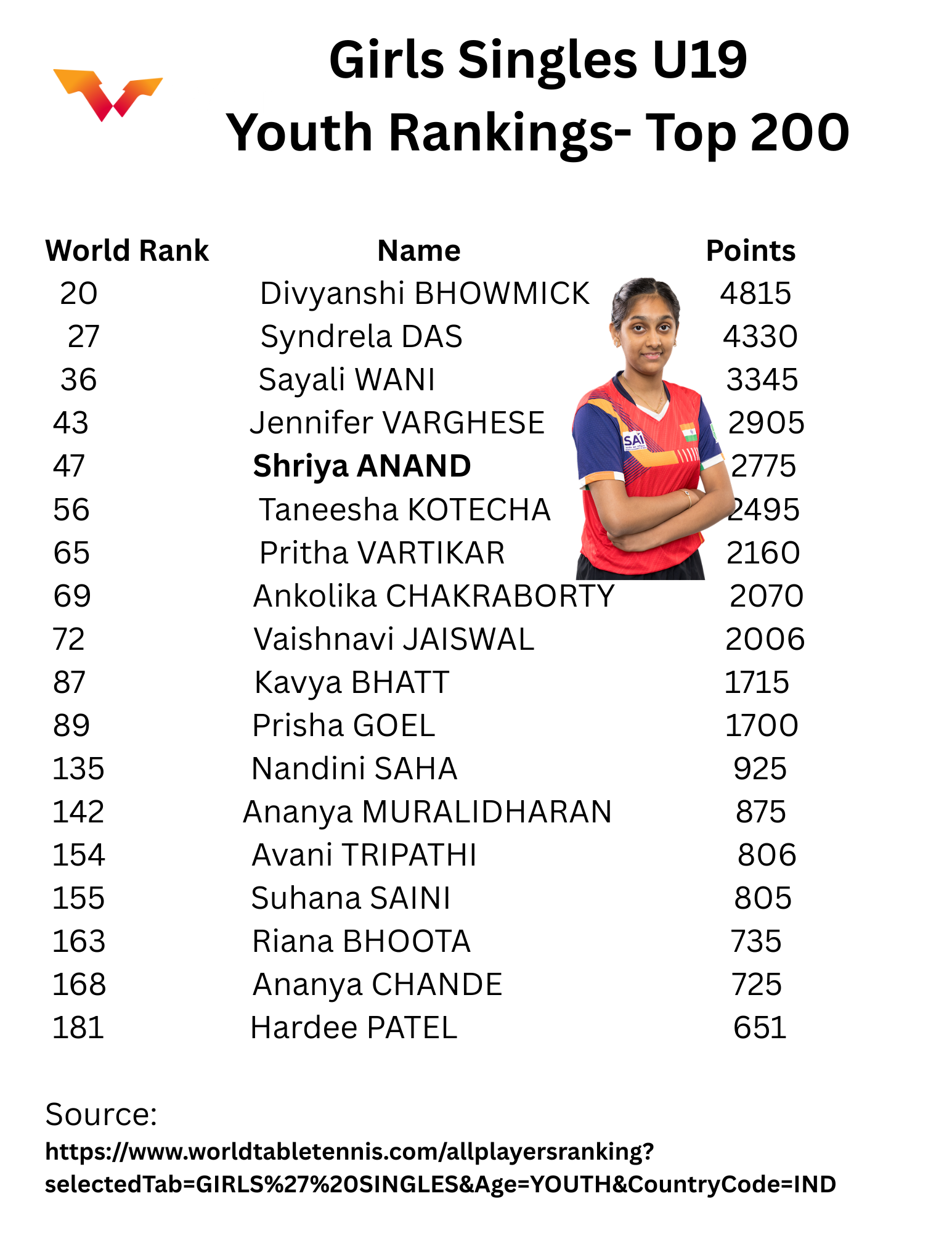 WTT World Ranking Youth Girls Indian Players in top 200.. Shriya Anand leads from TN