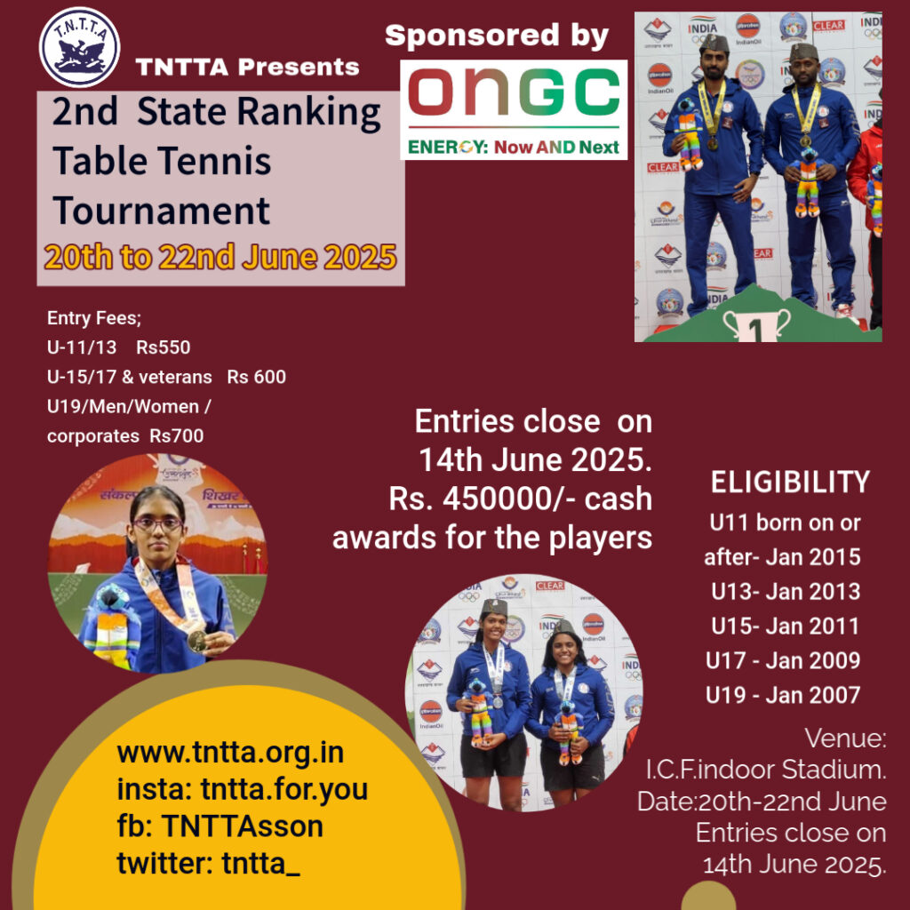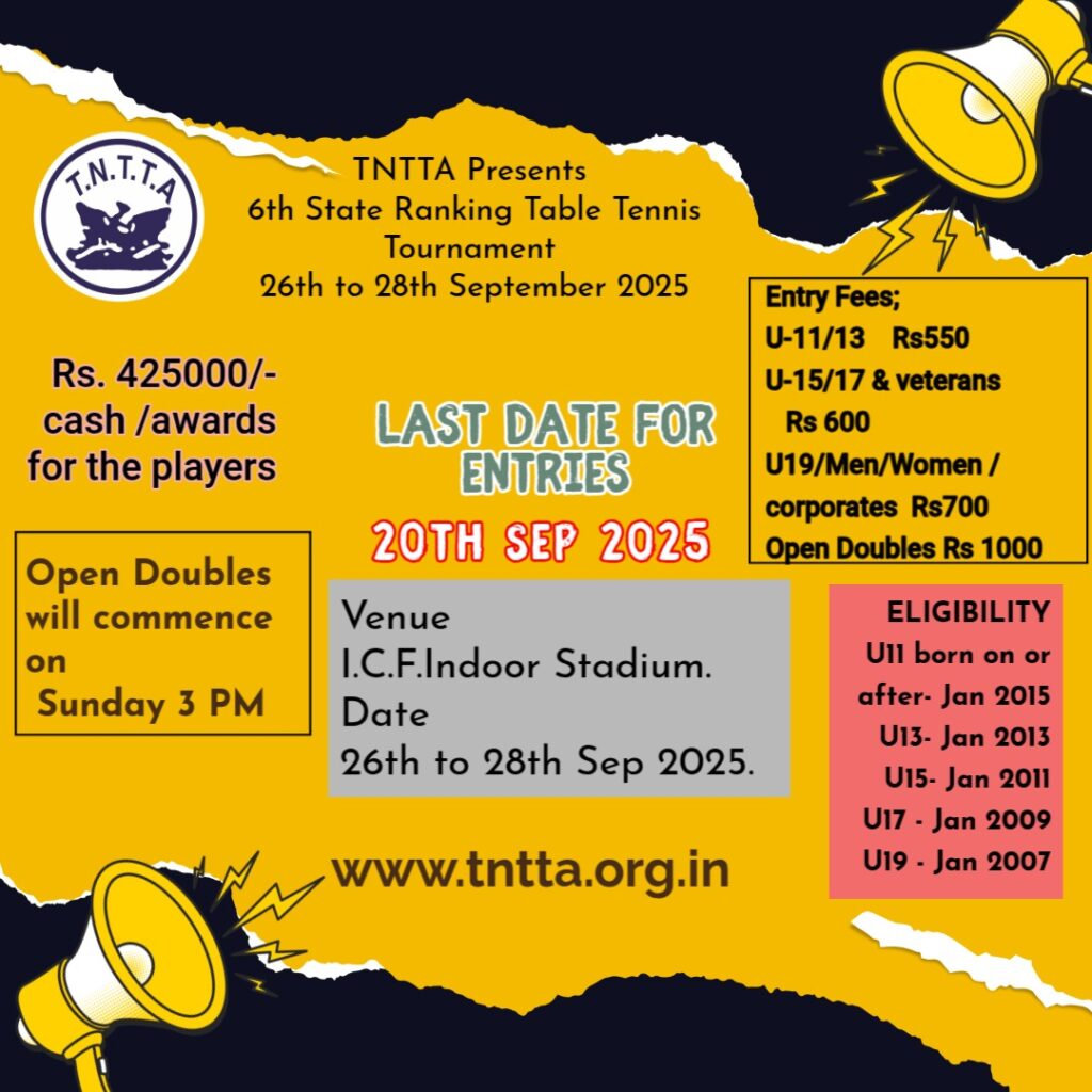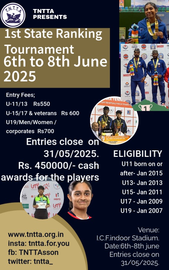 7th State Ranking Tournament 24th to 26th Oct 2025. Last Date for entries 18th Oct 2025