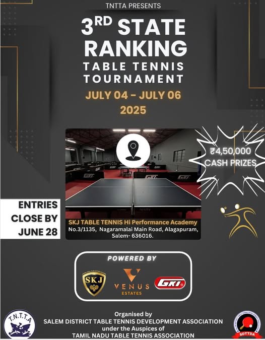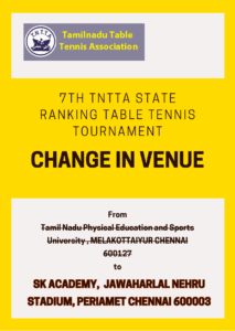 Change in venue for 7th TNTTA State Ranking Tournament from Sports University Melakottaiyur to SK Academy Chennai..