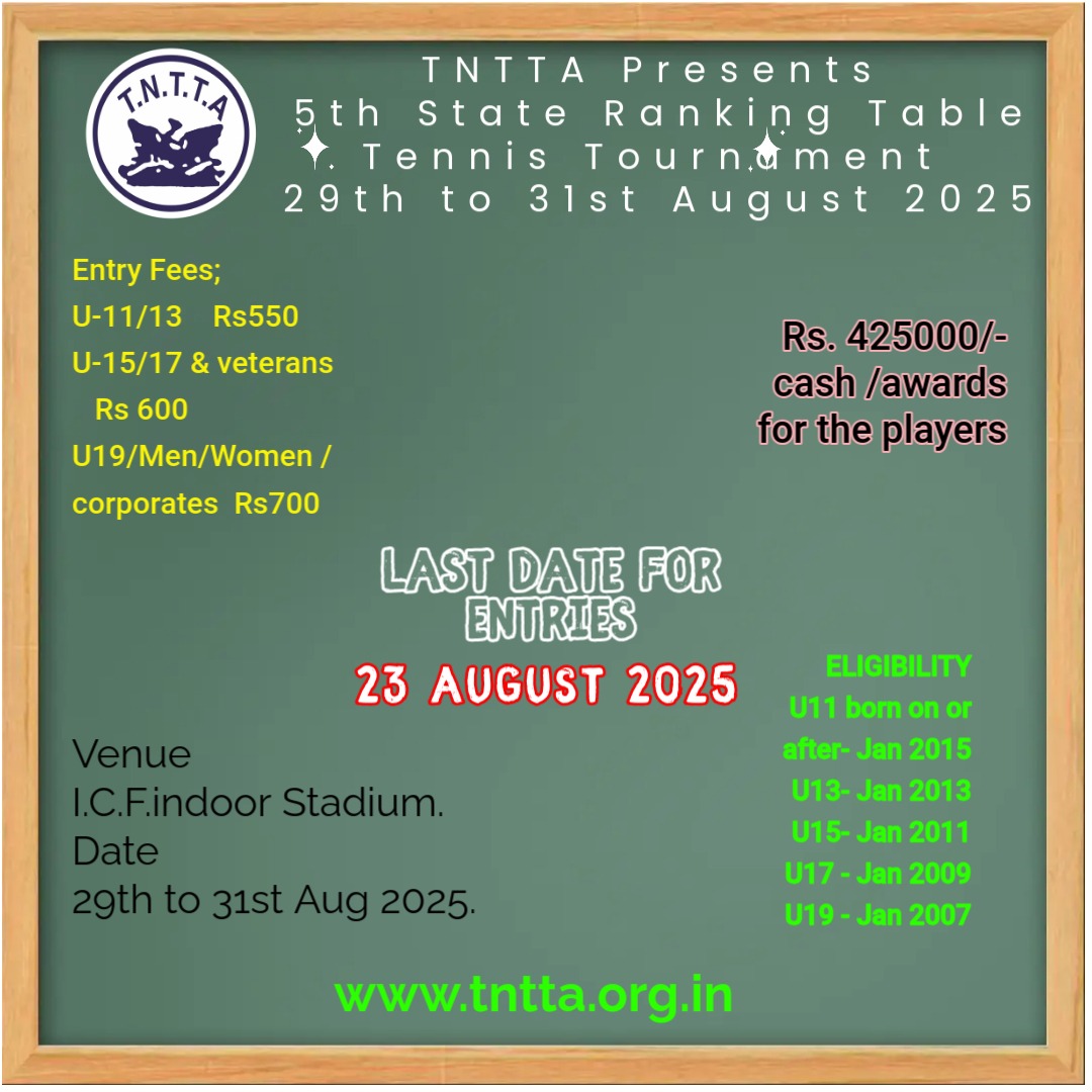 5th State Ranking Tournament29th Aug to 31st Aug 2025 Last Date for Entries 23rd Aug 2025