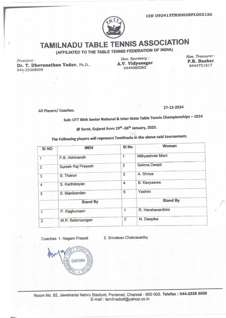 2. Event Name: UTT 86th Senior National & Inter-State Table Tennis Championships – 2024 Venue: Pandit Dindayal Upadhyay Indoor Stadium, Maharaja Agrasen Road, Athwalines, Surat, Gujarat – 395001 Date: January 19 – 26, 2025