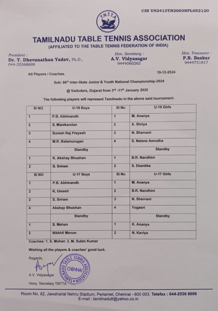 The team for the Tamil Nadu state for U17, U19 & Seniors for the 86th Inter State U17 & U19 National Championships 2024 has been announced …